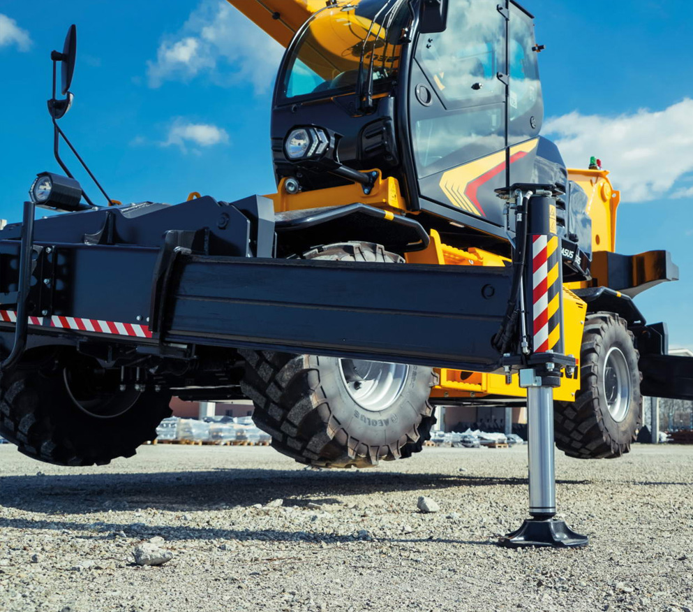 Bezpieczniejsza praca w każdych warunkach dzięki specjalnemu projektowi podpór stabilizujących z belką, które można uruchomić z dowolnej pozycji i w każdej konfiguracji.