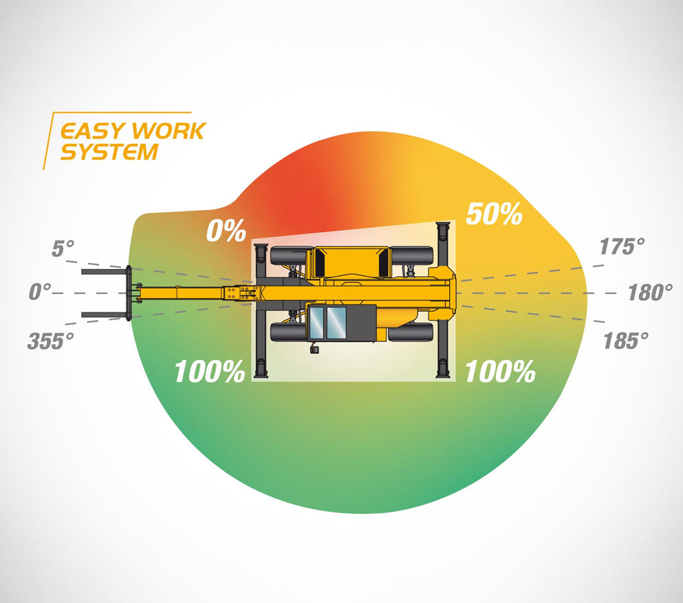 Automatyczne dopasowanie do obszaru roboczego odpowiednio do pozycji stóp podpór stabilizujących.